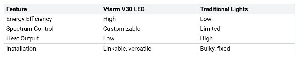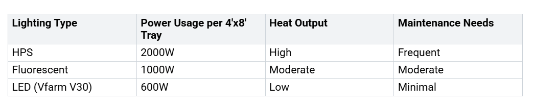 ، در حالی که سیستم های HPS به 2000 وات برای همان منطقه نیاز دارند. این به معنای صرفه جویی قابل توجه در انرژی و کاهش قبض برق است. LED ها همچنین گرمای کمتری از خود ساطع می کنند، به این معنی که شما هزینه کمتری برای خنک سازی می کنید و می توانید چراغ ها را نزدیک تر به محصولات خود قرار دهید. درایور یکپارچه Vfarm V30 و طراحی ضد آب IP65 عملکرد قابل اعتماد را در محیطهای سخت تضمین میکند و هزینههای نگهداری و عملیاتی را بیشتر کاهش میدهد.