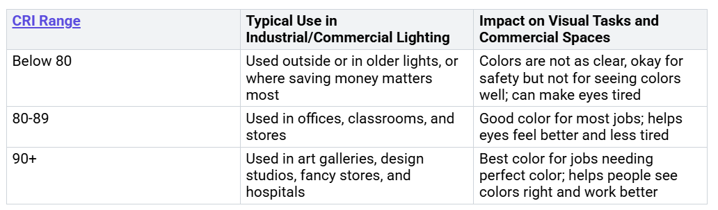 LED در وسایل بلند و نازککمک به روشن شدن یکنواخت این کار باعث میشود چشمهای شما راحتتر شود و به شما کمک میکند بهتر ببینید. در مشاغل، دقت رنگ مهم است. روشنایی خطی صنعتی معمولا دارای یکCRI بین 80 تا 90. CRI 80 یا بیشتر برای اکثر مشاغل خوب است. CRI 90 یا بیشتر برای مکان هایی که رنگ باید دقیق باشد بهترین است. CRI بالاتر به معنای رنگ بهتر، راحتی بیشتر و کار ایمن تر است. این به افراد کمک می کند تا وظایف خود را بهتر انجام دهند.