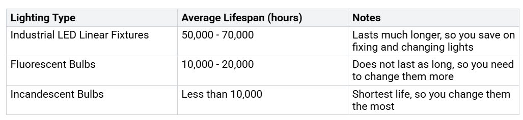 اکثر چراغ های خطی LED بین 50000 تا 70000 ساعت کار می کنند. آنها برای مدت طولانی دوام می آورند، بنابراین کسب و کارها نیازی به تعویض اغلب آنها ندارند.