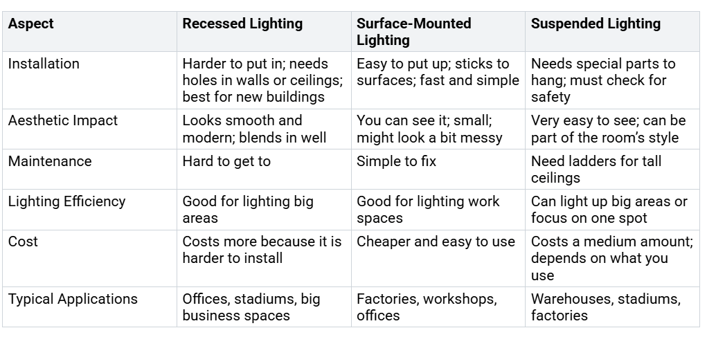 روشنایی خطی در چند نوع اصلی وجود دارد. هر نوع برای مکان ها و نیازهای مختلف بهترین کار را دارد. سه نوع اصلی عبارتند از: روکار، فرورفته و معلق. هر کدام نقاط خوب خود را برای فضاهای تجاری دارند.