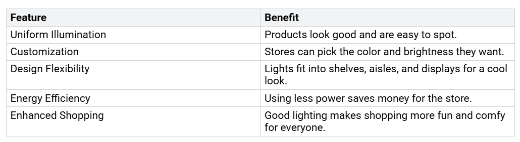 فروشگاه ها از نورپردازی خطی برای نشان دادن محصولات و لذت بردن از خرید استفاده می کنند. نور روشن و یکنواخت به مشتریان کمک می کند همه چیز را به وضوح ببینند. هیچ نقطه تاریک یا سایه های خشن وجود ندارد. راجدول زیر نشان می دهد که چگونه نور خطی به ذخیره سازی کمک می کند: